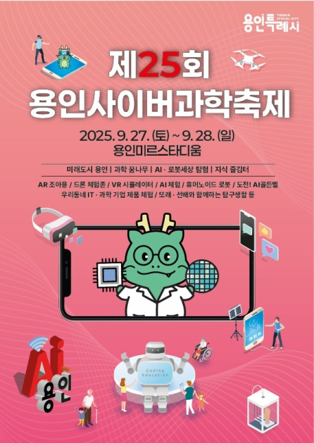 경기 용인시가 27일과 28일 용인미르스타디움에서 ‘2025 용인사이버과학축제’를 연다. ‘제30회 용인시민의 날’ 행사와 함께 열리는 이번 축제에서는 AI·로봇 세상 탐험대, 미래도시 용인, 과학 꿈나무, 과학놀이터 등 4개 체험 존이 운영된다. 축제 기간 중에는 매일 오전 11시 메인 무대에서는 인공지능 기술과 관련한 퀴즈를 푸는 ‘도전! AI 골든벨’이 펼쳐진다.