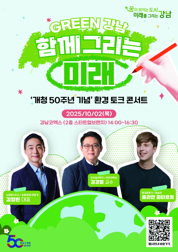서울 강남구가 개청 50주년을 기념해 10월 2일 오후 2시에 코엑스 스타트업브랜치에서 ‘GREEN 강남, 함께 그리는 미래’를 주제로 ‘환경 토크 콘서트’를 개최한다.